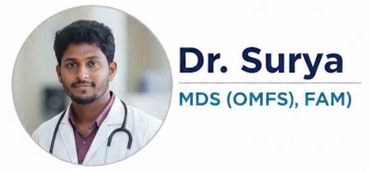 Dr. Surya, MDS (OMFS), FAM is a highly experienced Oral and Maxillofacial Surgeon providing advanced surgical and cosmetic treatments with a strong focus on safety, accuracy, and natural outcomes. His clinical practice is built on ethical care, evidence-based techniques, and patient confidence.
